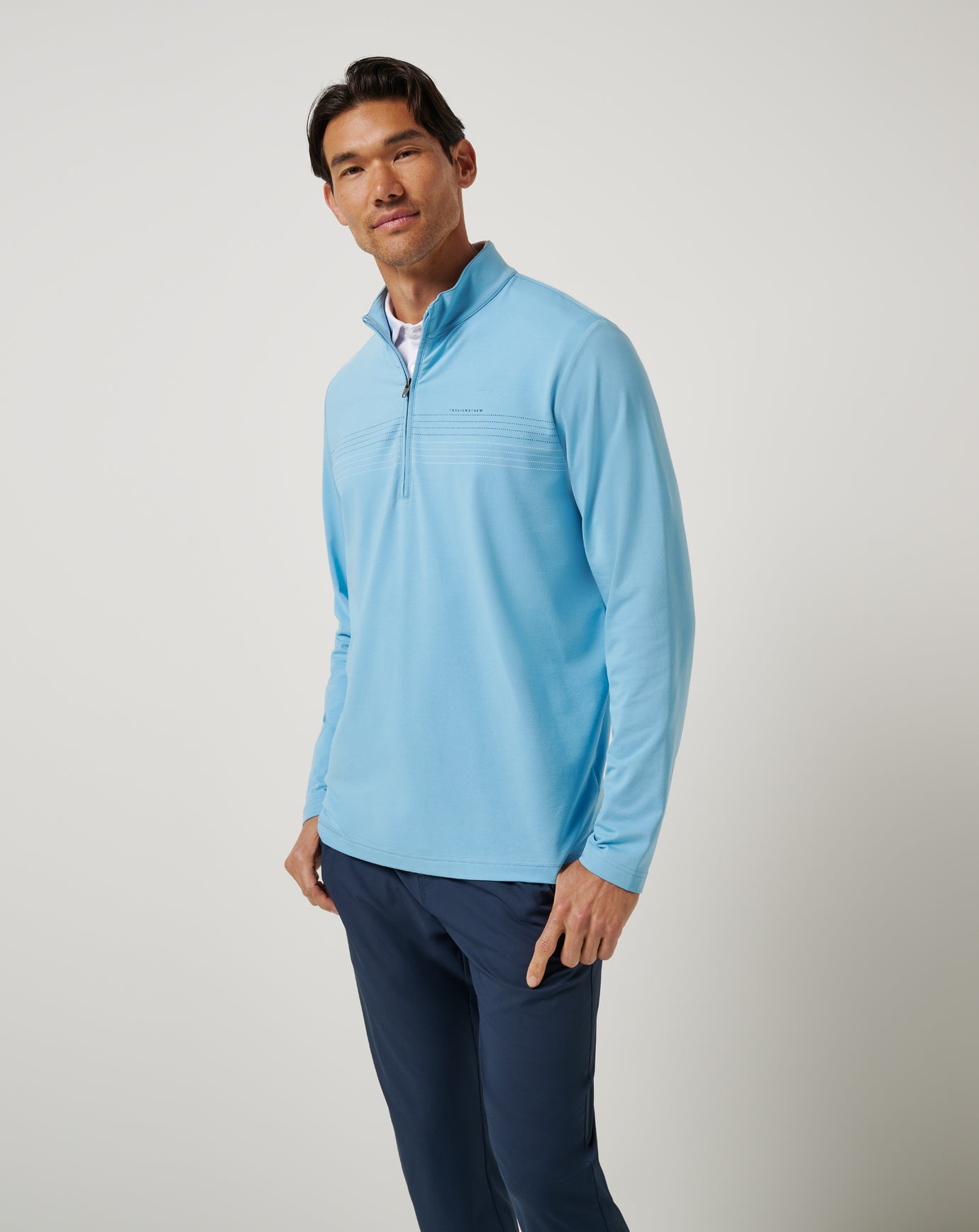 You didn’t get upgraded, but you look like you did. FIRST CLASS SEAT is that polished quarter zip you throw on when the group chat says “casual” but you’re not trying to risk it. Lightweight, breathable, and finished with a sharp chest stripe—it’s comfort that reads like effort (without actually requiring any).