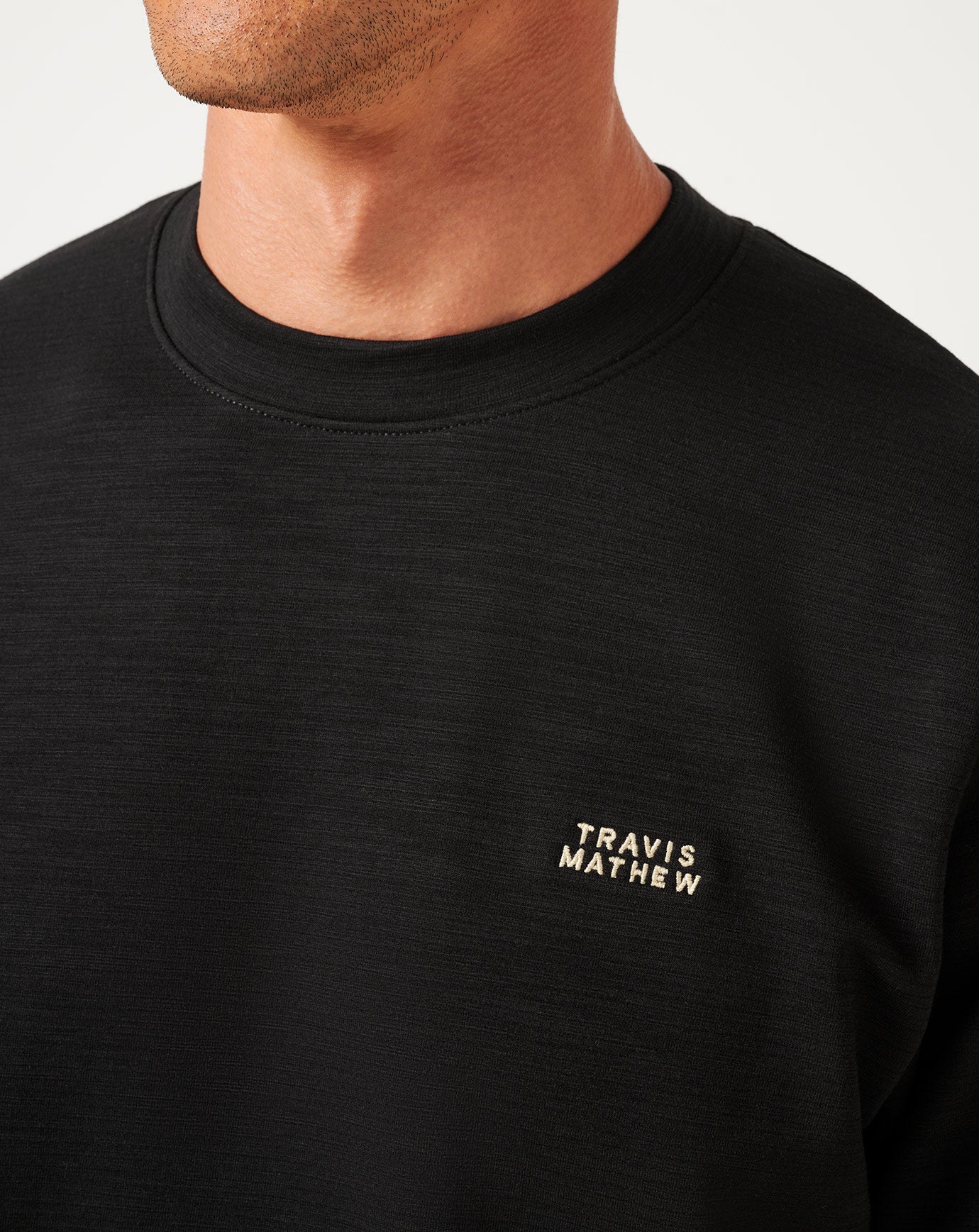 - Embroidered TravisMathew block logo on front left chest.